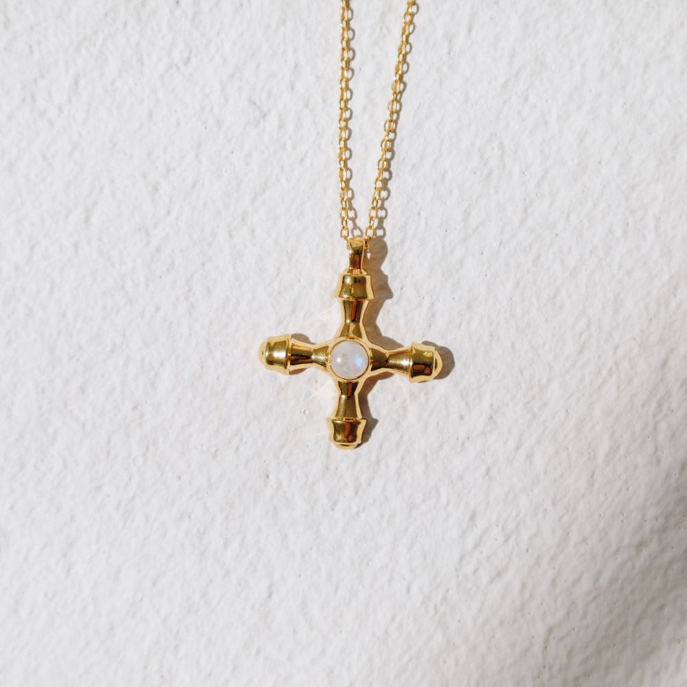 This beautiful detailed high fashion cross necklace is set with a natural Moonstone stone.