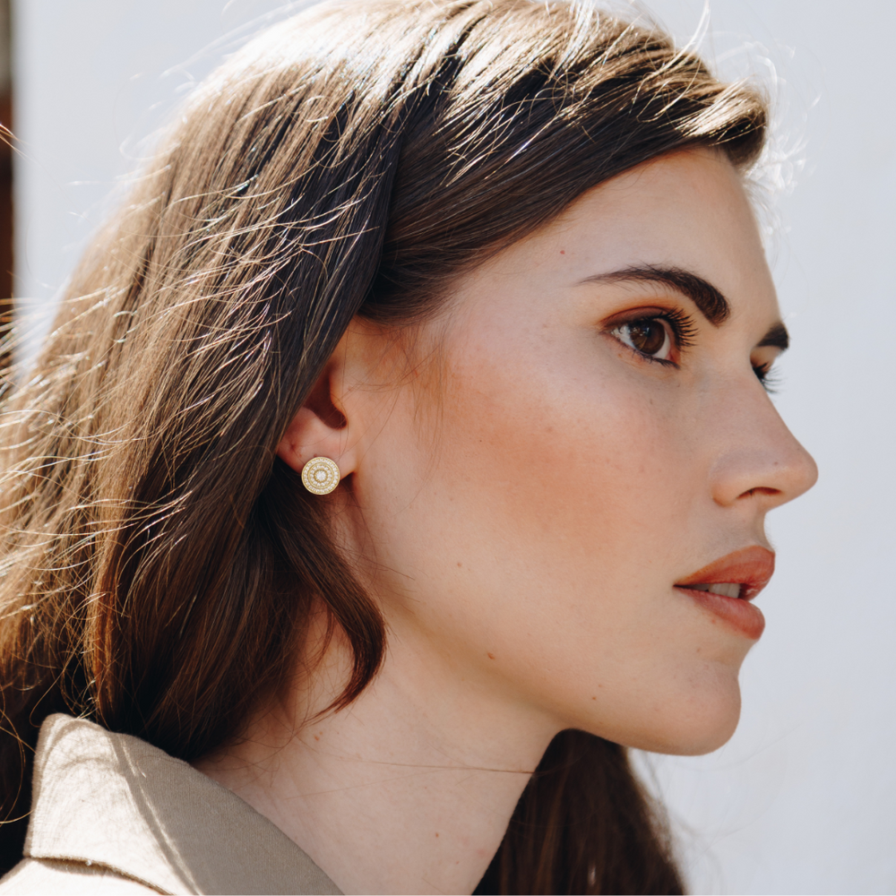 Robyn Real Jewels Egyptian Shield Pendant Studs is an intricate detailed stud earring that features real Cubic Zirconia stones that are inspired by the Egyptian culture.